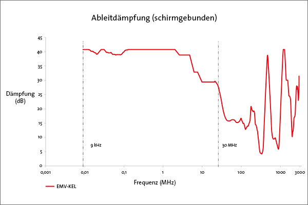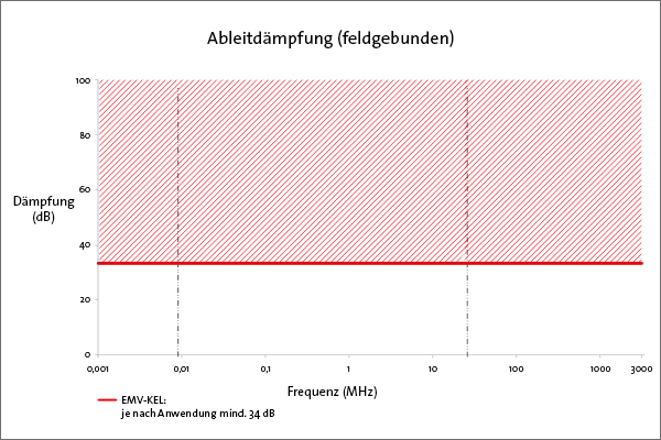 Bei den feldgebundenen St?rungen wurden, je nach Anwendung, in den relevanten Frequenzbereichen bis 3 GHz konstante Messungen von mind. 34 dB erzielt. Unter diesen D?mpfungsbereich f?llt die Kurve erst bei extrem hohen Frequenzen oberhalb von 3 GHz.