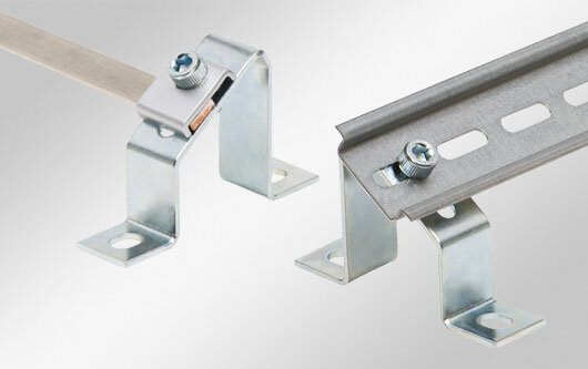 Mounting feet for 10 x 3 mm bus bars and 35 mm top hat DIN rails.