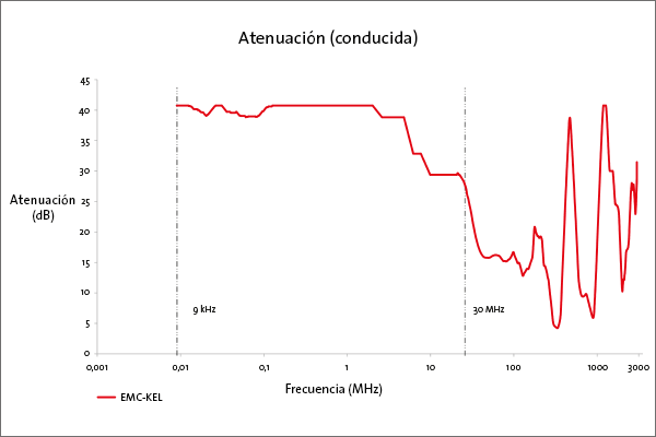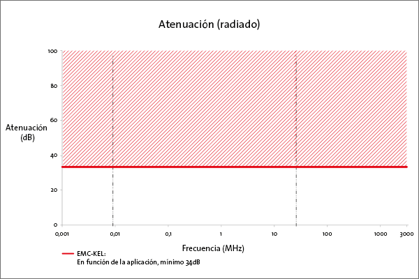 Dentro del espectro de las perturbaciones radiadas, hasta la banda de frecuencia de 3 GHz se obtiene una atenuación de 34 dB. Sólo a partir de 3 GHz la atenuación cae por debajo de los 34 dB.