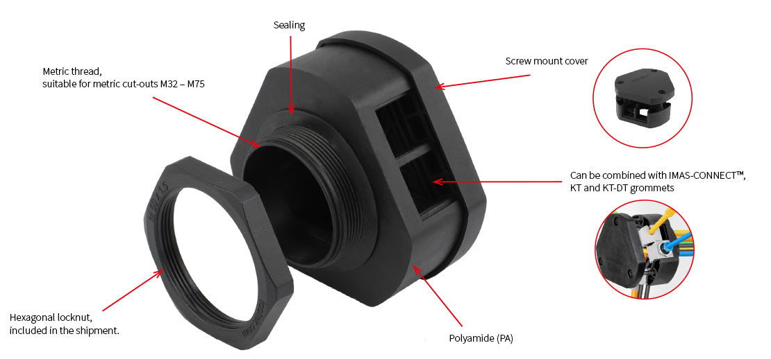 Jos kierteen pituus ei ole riitt?v?, esimerkiksi asennettaessa l?pivienti? sandwich -tyyppiseen levyyn tai paksuun betonisein??n, icotek tarjoaa k?yt?nn?llisen ratkaisun: icotek -jatkomoduli!