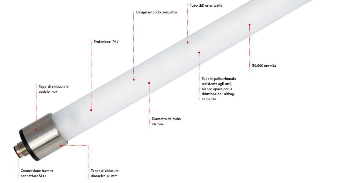 Il sistema di illuminazione TUBE fornisce un‘illuminazione efficace per macchinari e apparecchiature, con connettori M12 per un collegamento standard.