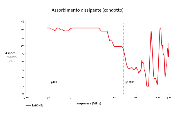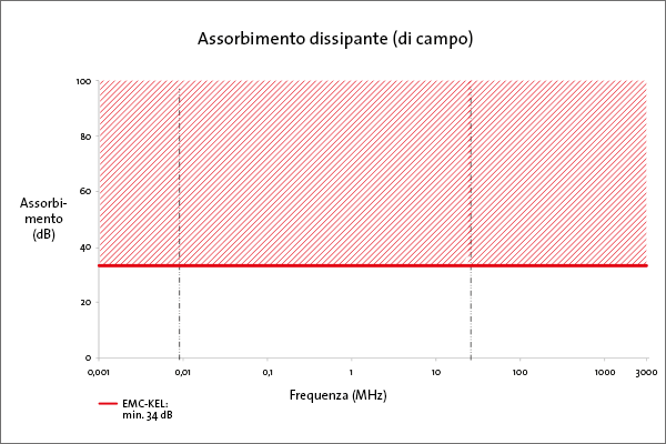 Per quanto riguarda i disturbi di campo ed in base all'applicazione, nella gamma di frequenza rilevante fino a 3 GHz sono stati raggiunte misure costanti fino a 34 dB. Sotto l'intervallo di attenuazione, la curva cade solo a frequenze estremamente alte, sopra i 3 GHz.