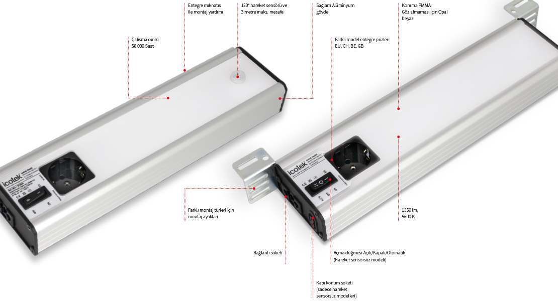 Pratik bir ek kullan?m olarak, ALU-LINE ayd?nlatmalarda entegre bir priz mevcut. Bunlar farkl? ülkelere uygundur.